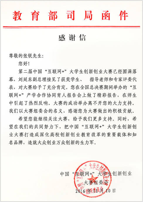 2018年,球探体育比分网连续多年为中国国际互联网+大学生创新创业大赛做出积极贡献,获教育部来函致谢。